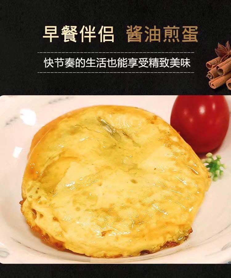 ????對于許多人來講,早飯都會有煎蛋,但由于早晨時間較緊,并沒有太多的時間去做早飯,因此我公司推出了真空包裝的醬油煎蛋,食用時只需簡單加熱,而且攜帶方法,保質(zhì)期長。當(dāng)然,在家中自己做醬油煎蛋的話,整個過程也并不復(fù)雜。